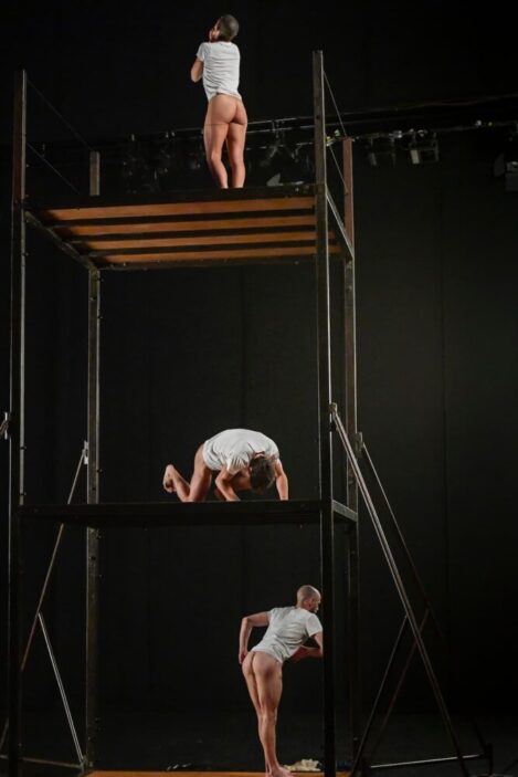 In the centre of the stage sits a three-storey structure with one dancer on each level shadowboxing and running on the spot while the guitars and drums crash around them menacingly. As the music goes down, they shed their pants and throw themselves around their cubic cells, dropping to the floor as if felled by invisible wrestlers before flopping around like fish plucked out of the water for forty minutes.