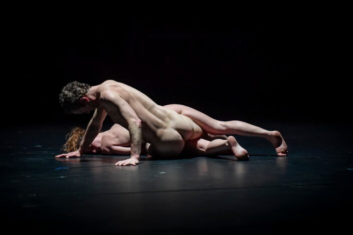 After another PJ interlude, two dancers emerge for the more meditative herses, duo, which evolves at an almost sculptural pace as two naked bodies writhe over and around one another. Charmatz supports Johanna Elisa Lemke as he rolls around, contorting his body so that she barely touches the