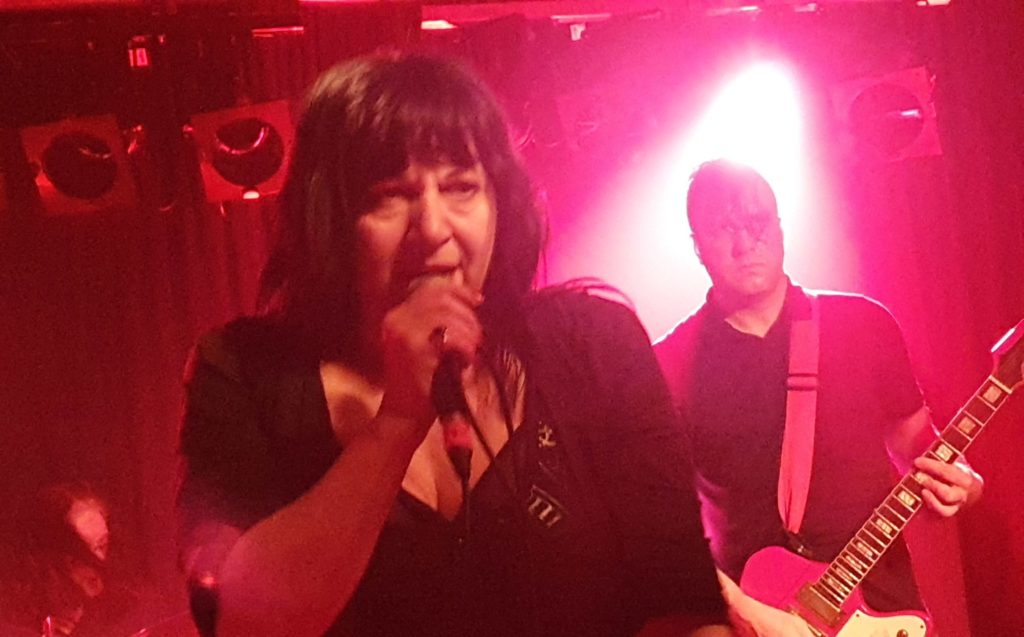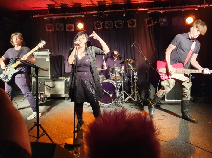 Lydia came on stage in all black. Black dress with Wicca symbols, black hair, black boots and outrageously red lipstick. This is a woman who’s been singing punk for years and knows her way around the stage (even if a few song sheets are needed to remind her of the words).