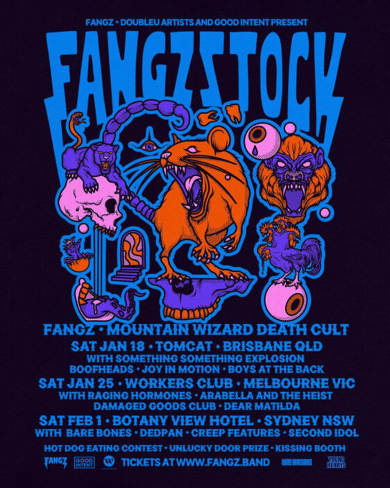 The official return of FANGZstock was announced alongside the single release, with the festival going interstate, hitting up venues in Brisbane, Melbourne, and Sydney. Mountain Wizard Death Cult will join FANGZ at all dates, with a slew of local acts taking to the stage in each city. There’ll also be hot dog eating contests, unlucky door prizes, and kissing booths. Well, that’s one way to follow up a 24 hour tour, right?