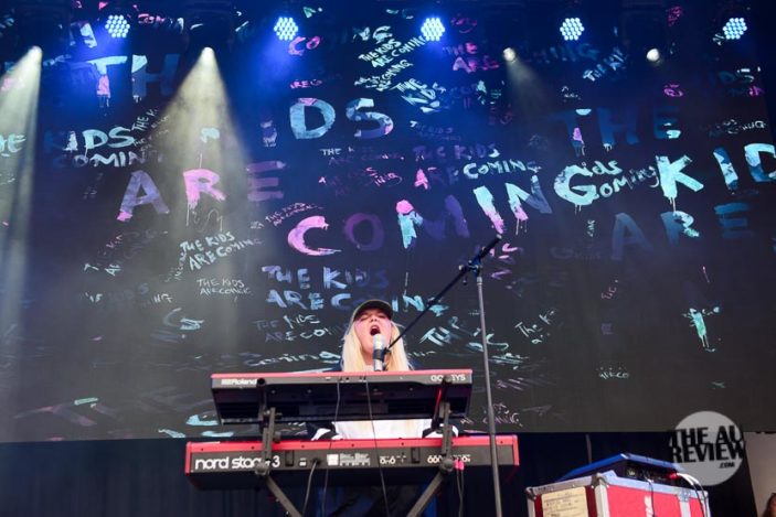 Charli XCX arrived on stage in a stunning white outfit that was a stylized straight-jacket but this is way to simple a description. Dark glasses, long purple hair, hooks and streamers all added to the look, but the vibe was pure energy and fun. Her Icona Pop cover “I Love It” was a popular sing-a-long that set the pace for the rest of the set.