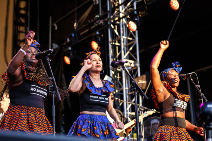 Marina Satti and Fonés, from Greece was a wonderful surprise find for me on the smaller stage 3. Satti is the charismatic bandleader, who blends Greek and Middle-Eastern sounds and dance, with the Fonés – four female, harmonising, polyphonic vocalists who support her vocally and with some fantastic dance moves. Satti was full of cheeky energy, and seems perfectly at ease on the stage performing a set full of infectious melodies, sometimes up-beat and sometimes moving, but always entrancing to watch.