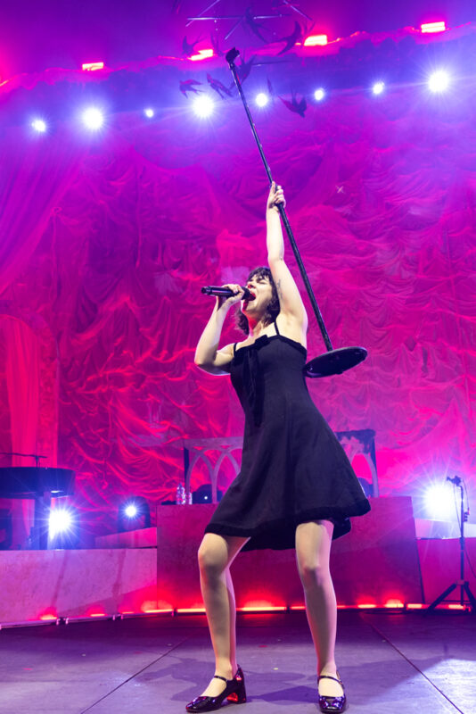 Entering the stage a little after 9:15pm, The Last Dinner Party hit the ground running, opening with “Agnus Dei”, the opener from their superb 2025 album From The Pyre. One of the more expansive tracks from the album, it was the perfect opener for the night, setting the scene for what will likely be the show of the year for many of those in attendance. Leaning heavily into the rock opera dramatics of their sounds, their stage setup was elaborate and expansive, allowing each member of the band plenty of space to show off their wares while embracing a lighting show that fit the mood and space perfectly.
