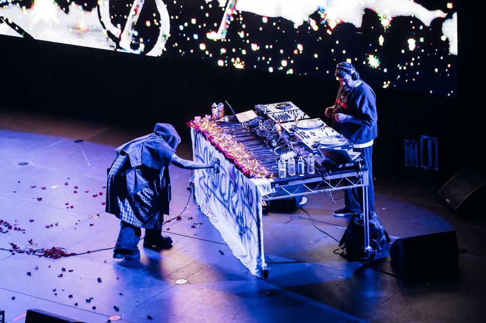 Throughout, Bey moved across DOOM’s projects, mostly focusing on MM..FOOD and Madvillainy, featuring well-known classics of DOOM such as “ALL CAPS”, “Rhymes Like Dimes” and “Accordion”. Between songs chants of ‘Love’ from Bey as he continued his artwork, along with him chanting “Free Congo! Free Sudan! Free Gaza! Free WIFI!” were common. Bey’s renditions of songs such as “Fazers” (released by DOOM under his King Geedorah moniker) and “Papermills” brought a more introspective vibe.