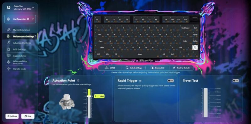 The included GravaStar x Gateron Magnetic Jade Gaming Switches are certainly more linear compared to something a little louder and clickier, but have been engineered for adjustable actuation at 0.1mm increments, beginning at just 0.005mm. Once again, a super impressive feat for competitive gamers, even if that makes typing a little tricky, with all the accidental key presses.
