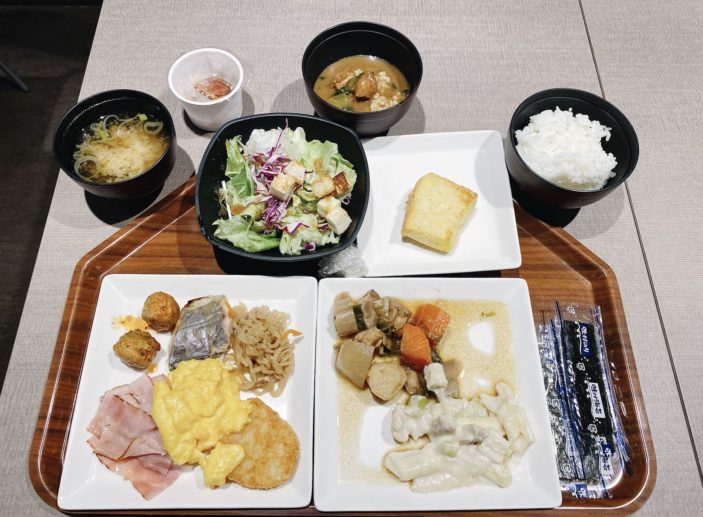 The usual suspects of salad, bacon, eggs and toast were available, as was nimono (a simmered Japanese dish), rice, curry, natto and fruit.