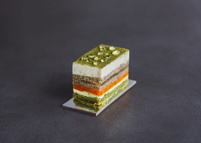 Designed to reference a smell and taste redolent of rainfall, it comprises a matcha sponge base, layers of lime buttercream, caramelised apricot compote, lemon myrtle and peppermint sponge, a vein of finger lime jelly, and a white chocolate mousse dusted with lemon myrtle powder. It’s decorated with ‘rain droplets’ delicately dancing atop the cake.