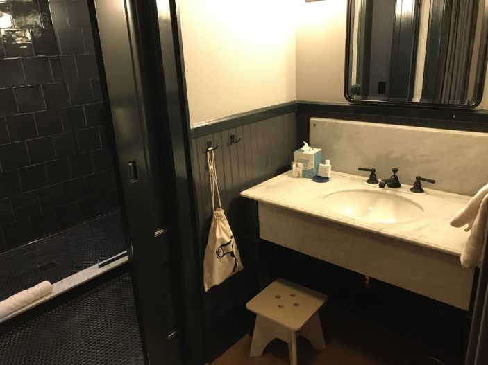 A key design element of the Ace Hotel brand, is that they endeavour to makes you feel like you’ve travelled back in time, with older style furnishings and colours; greens and blacks and browns run through the room, including the full size SMEG fridge, which is crammed full of treats available at a nominal fee, and there’s an events calendar hanging on it to encourage you to visit their on site entertainment and dining options.