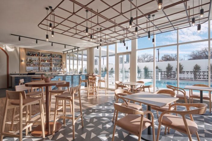 Alba’s restaurant isn’t tucked away, attempting to be exclusive or overly fancy. ela is a subtle continuation of the lobby, staying connected to the dappled aquamarine pool through a wall of windows and an outdoor seating area. The bar is a centrepiece that stands out from across the lobby, with a wall of bottles glowing in front of a mirrored backdrop, only separated from the sit-down dining space by a line of blue velvet booths.
