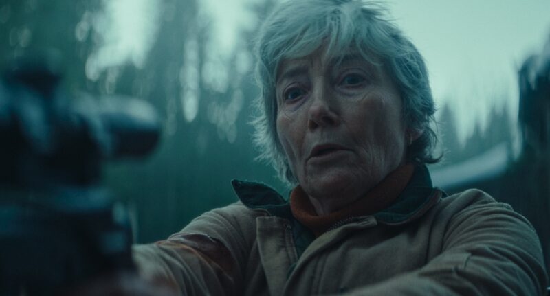 The man who gives her directions, simply credited as “Camo Jacket” (Marc Menchaca), due so to his attire, has a suspicious energy to him, and though Barb notices his odd demeanor when they are conversing, she doesn’t entirely press for her own safety. As she prepares to set up on the frozen lake – Lake Hilda – she witnesses Camo Jacket chasing a young woman out of the woods, threatening her with a rifle, and dragging her back to his compound. Barb, immediately feeling a sense of protection towards the woman, Leah (Laurel Marsden), follows him back, only to then be shot at and wounded by the “Purple Lady” (Judy Greer), another attire-related moniker, whose particular aggression very much sets her up as the brains of whatever operation is being carried out.