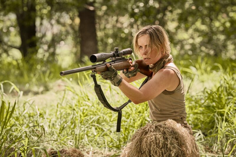 What distinguishes the film is how closely it aligns with Sciberras’ stated intention: this is action built on pressure rather than scale. Drawing inspiration from grounded thrillers like Sicario and The Hurt Locker, she leans into the psychology of sniper warfare – the waiting, the silence, the constant sense that danger is already present, just not yet visible. Much of the film unfolds in that uneasy stillness, and while the budget occasionally shows, the direction compensates with careful staging and a strong sense of spatial awareness. The farmhouse itself becomes less a home than a tactical zone, every window and paddock line charged with threat.