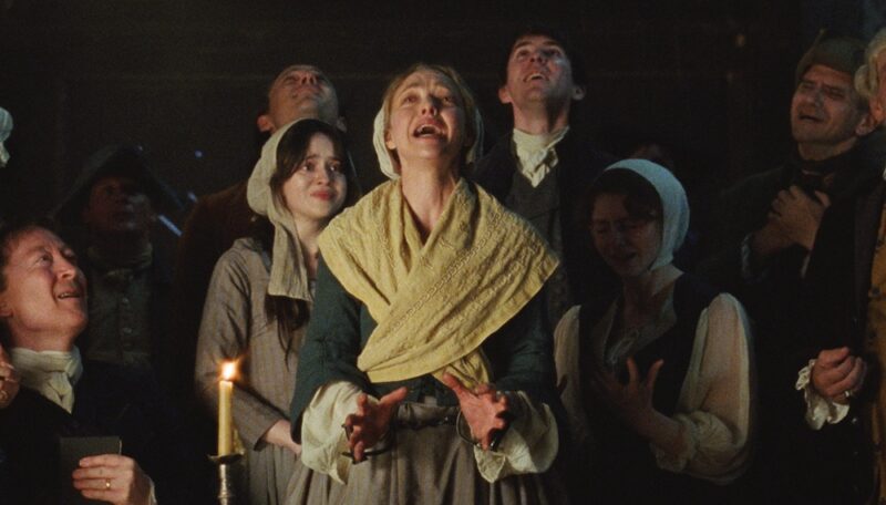 Fastvold’s insistence on grounding these sequences in reality extended to the film’s technical choices. Shot on 35mm film and later blown up to 70mm, The Testament of Ann Lee uses scale not for grandeur, but for intimacy. The 70mm presentation, Fastvold explains, allowed for greater detail in darker scenes and large communal moments, capturing the physicality of bodies in motion and the tactile reality of lived-in spaces. Celluloid, for her, remains essential: “I love shooting on film. I love what it gives you in texture, depth, and presence.”
